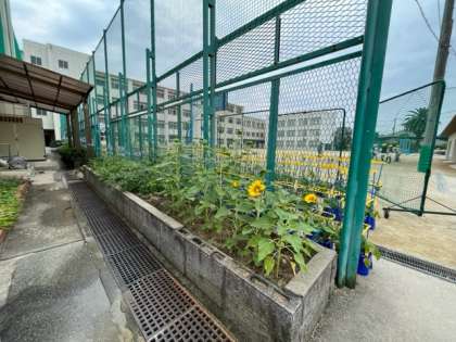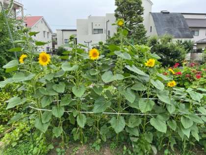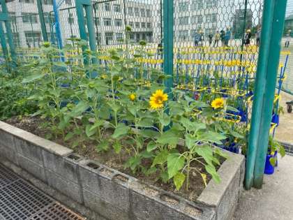 今シーズン最初の「ひまわり」の開花は、地域園芸クラブからいただいた「ひまわり」です。給食室の南側と自然観察園で咲いています。