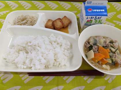 6月26日(月)のこんだては「中華煮、あつあげのピリ辛じょうゆかけ、もやしの中華あえ、ごはん、牛乳」です。
