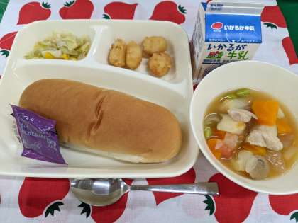 6月27日(火)のこんだては「いかてんぷら、フレッシュトマトのスープ煮、キャベツとコーンのソテー、コッペパン、ブルーベリージャム、牛乳」です。