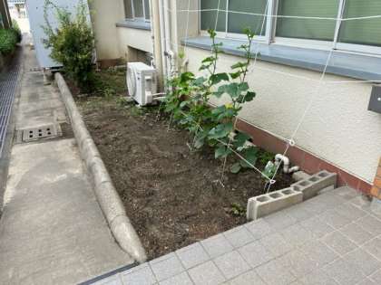 管理作業員室の南側の花壇、緑のカーテンできゅうり・ゴーヤ、ヘチマを植えています。