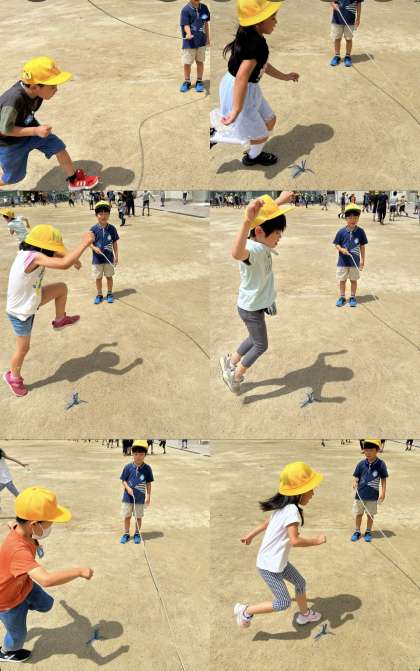 休み時間に初めて、大縄で遊びました!青色のポイント目指し、走ってジャンプ!「またやりたい!」と好評でした!コツを伝えて、大縄マスターが誕生することを期待しています!