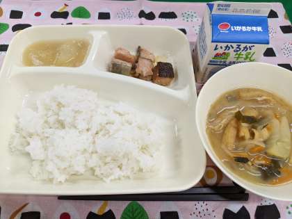 7月3日(月)のこんだては「さけのつけ焼き、みそ汁、とうがんの煮もの、ごはん、牛乳」です。