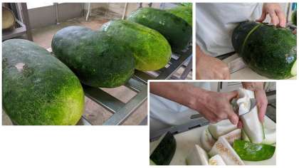 とうがんは夏が旬の野菜ですが、冬まで保存できることから「冬瓜」と言われます。水分が多く、体を冷やす働きがあり、夏にぴったりの野菜です。「とうがんの煮もの」は鶏肉とともに、しょうがの風味をきかせただしで煮ています。