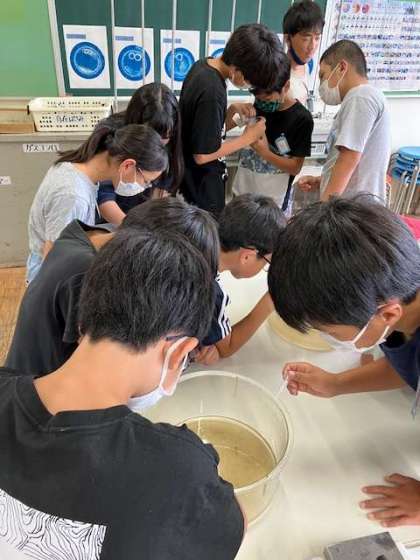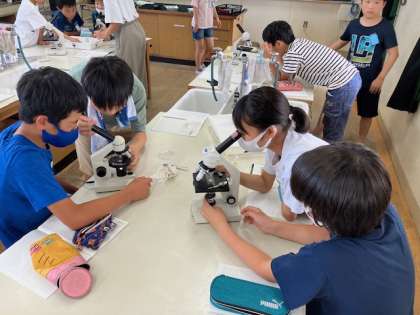 学習園のとんぼ池にも、食物連鎖が見られるかどうかを調べました。プレパラートをつくり、顕微鏡で観察をします。