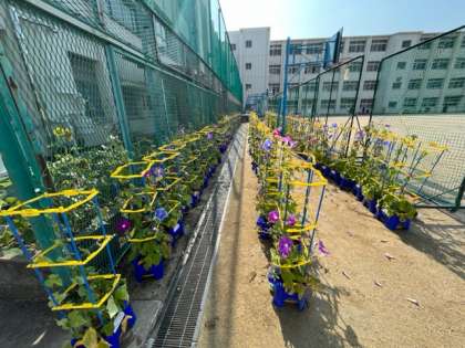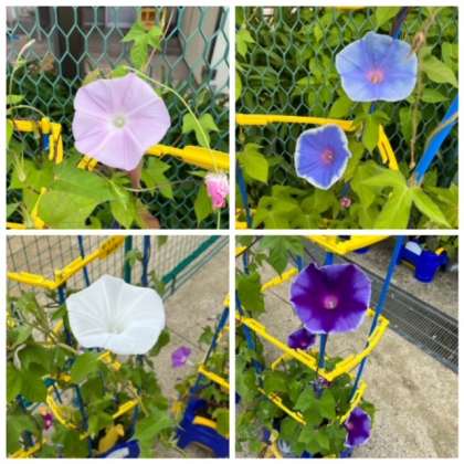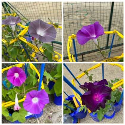 今年は玄関から日当たりのよいグランドに移動させたことで、花付きがよく、とても元気なアサガオに育っています。