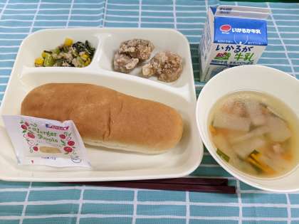 7月11日(火)のこんだては「鶏肉のからあげ、とうがんの中華スープ、ツナとチンゲンサイのいためもの、コッペパン、りんごジャム、牛乳」です。