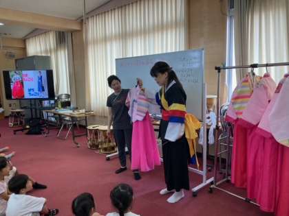 あいさつや伝統衣装のチョゴリ、たくさんの楽器の話をしてくれました。