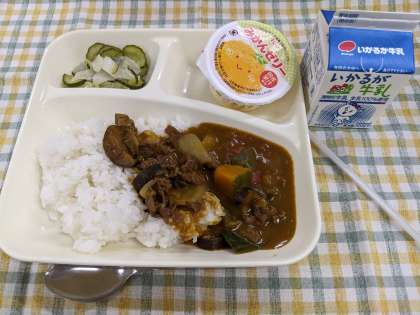 7月12日(水)のこんだては「夏野菜のカレーライス、キャベツときゅうりのサラダ、みかんゼリー、牛乳」です。