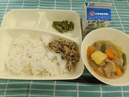 7月18日(火)のこんだては「豚肉とじゃがいもの煮もの、オクラの梅風味、ツナっ葉いため、ごはん、牛乳」です。