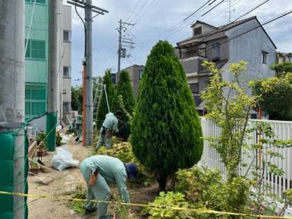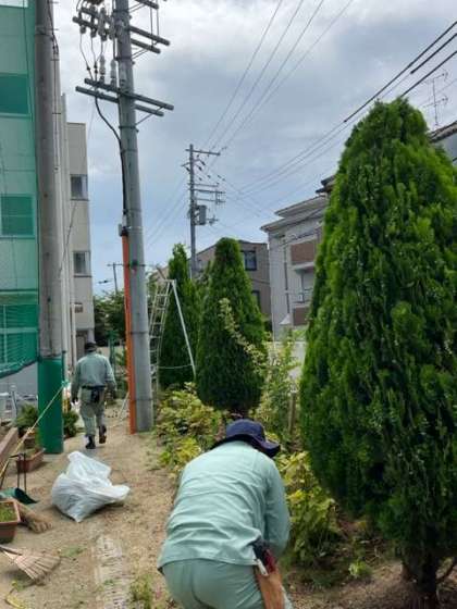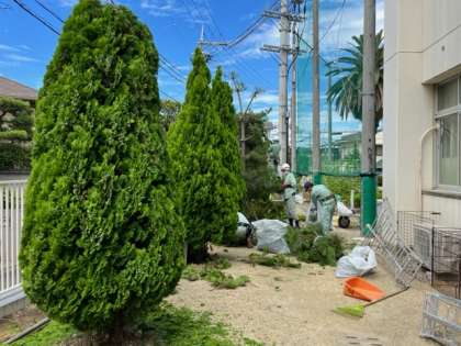 本日より3日間の予定で、校園営繕園芸事務所から樹木等の剪定作業に来ていただいています。管理作業員さんと連携しながら、校内を美しく整備していただいています。暑い中の作業、ありがとうございます。