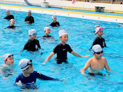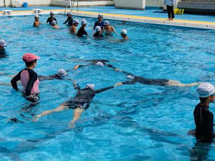 子ども達は、普段の授業とは違う水慣れの曲に合わせて笑顔で体を動かしており、とても楽しそうでした!