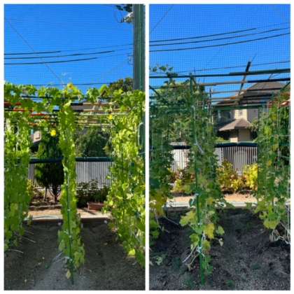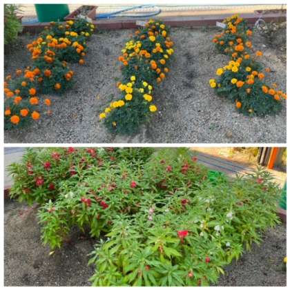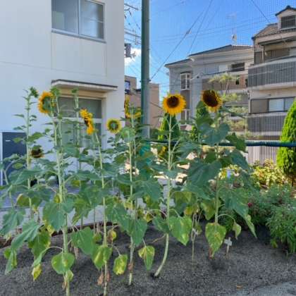 グランドの南側にある学習園、ヘチマ、ヒョウタン、マリーゴールド、ホウセンカ、ヒマワリが、暑さに負けることなく元気に育っています。