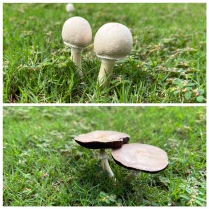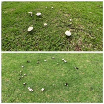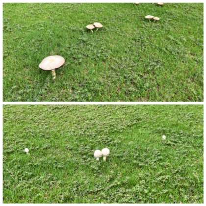 台風が過ぎ去ったあと、芝生にたくさんのきのこが生えていました。