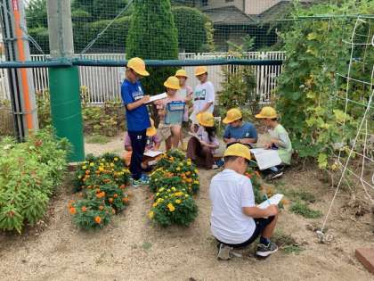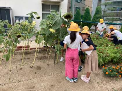 夏休みの間に、育てていたヒマワリ、マリーゴールド、ホウセンカがどれぐらい成長したか観察しました。