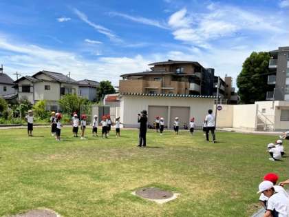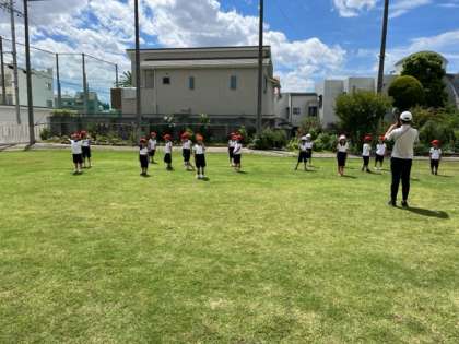 各クラス3つのチームに分けて、芝生広場で元気よく、一生懸命にラジオ体操をしました。