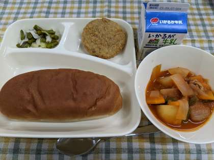 9月1日(金)のこんだては「チキンレバーカツ、ケチャップ煮、グリーンアスパラガスとキャベツのサラダ、黒糖パン、牛乳」です。