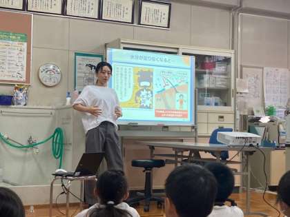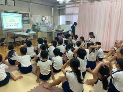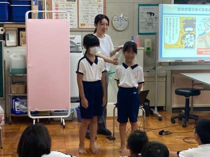 発育測定の前に、保健の先生と熱中症について学習しました。水分補給や朝ごはんの大切さなどを学びました。