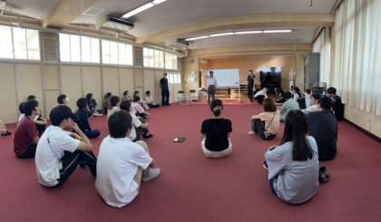 阿倍野警察署の警察官2名を講師としてお招きして、実際に不審者が校内に侵入したときの対処について、緊張感をもって研修しました。