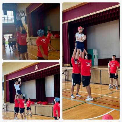 ラインアウトの際に行う、リフティングを福永先生も体験しました。