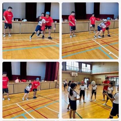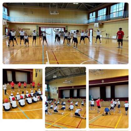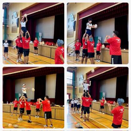 2組の子どもたちは、「上・下・右・左」と声を掛け合いながら友達と協力し、ボール送りのゲームを楽しんでいました。失敗したグループは、友達の前で「キラキラポーズ」を披露しました。恥ずかしがりながらも全力で取り組む姿が素晴らしかったです。ラインアウト体験では、寺本先生も体験しました。あまりの高さに驚きを隠せない様子の先生でした。