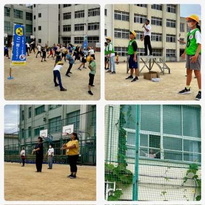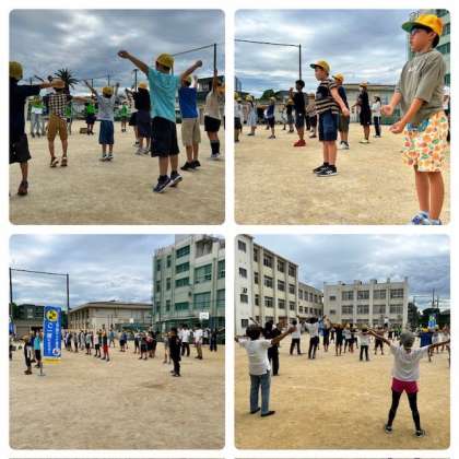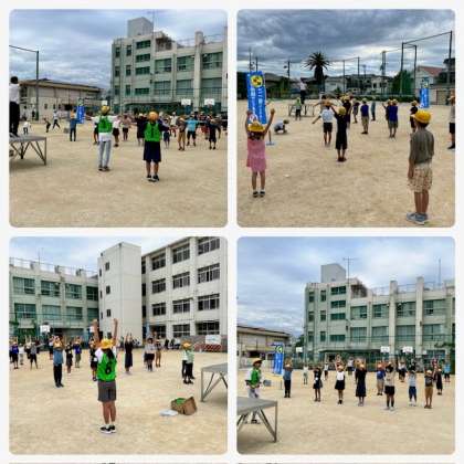 今日は木曜日。放課後は、みんなでラジオ体操です。先週の予告通り、校長先生のワンポイントレッスンがありました。初めの伸びの運動は「1・2」の間、両手を上へ上げ、大きく伸びます。すぐに腕を広げないことがポイントです。ポイント指導後は、そのポイントに気を付けてみんなでラジオ体操をしました。