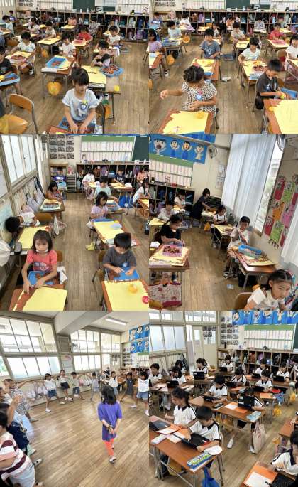 図工では、おむすびころりんの世界を画用紙で表現しています。2色の茶色の画用紙を小さくちぎり、地面の中の土や砂になるように貼っていきます。1年生にとっては、画用紙をちぎるのも、細かく貼っていくのも一苦労ですが、頑張っています!来週、再来週で、登場人物を描いていく予定です。完成が楽しみです!