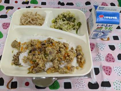 9月11日(月)のこんだては「他人丼〔個別対応献立:鶏卵〕、ささみと野菜のいためもの、もやしの甘酢あえ、牛乳」です。