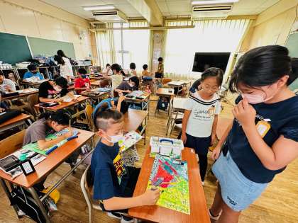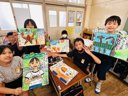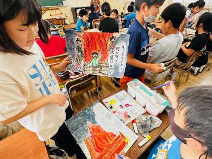子ども達は、写真や動画を見て林間学習を懐かしみ、顔をほころばせながら筆を動かしていました。