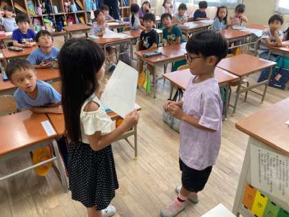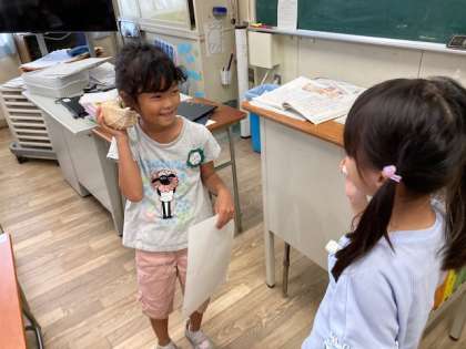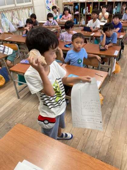 大きな貝殻を当てると音がして、子どもたちは驚き「感動した!」と言う子もいました。