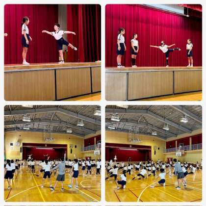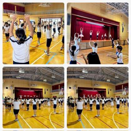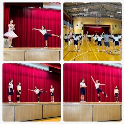続いて、踊りを体験しました。バレエを習っている6年生がお手本となりました。お手本の子どもたちは、背筋を伸ばした姿勢で立ち、バレエを披露することができました。アラベスクを見せると、周りの友達からは、感嘆の声があがりました!