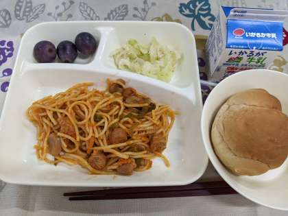 9月15日(金)のこんだては「イタリアンスパゲッティ、キャベツのバジル風味サラダ、ぶどう(巨峰)、1/2黒糖パン、牛乳」です。