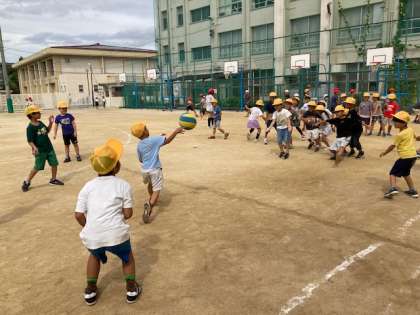 外で遊んでいた一年生みんなでドッチボールをしました。