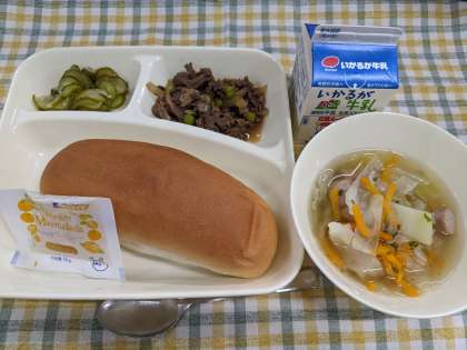 9月25日(月)のこんだては「牛肉のデミグラスソース煮、スープ、きゅうりのピクルス、コッペパン、マーマレード、牛乳」です。