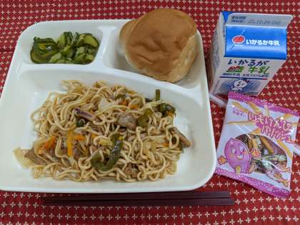 9月28日(木)のこんだては「焼きそば、きゅうりのしょうがづけ、いもけんぴフィッシュ、1/2黒糖パン、牛乳」です。