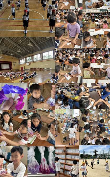 生活科では、大切に育てたあさがおとのお別れの時が来ました。つるは、参観時にリースとして生まれ変わりました。花は、色水として子どもたちを楽しませ、驚かせてくれました!また、自然観察園や芝生で虫とりをしに行きました。トンボは早すぎて、なかなか捕まえることができません。
