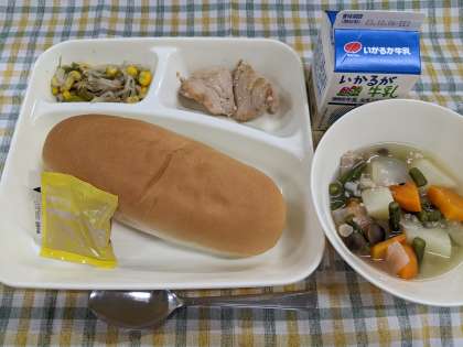 10月2日(月)のこんだては「鶏肉のガーリック焼き、スープ煮、野菜のソテー、コッペパン、アプリコットジャム、牛乳」です。