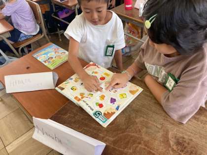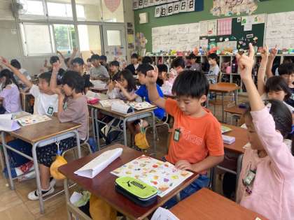 曲に合わせて、好きな色や食べ物などを尋ねたり、答えたりしていました。