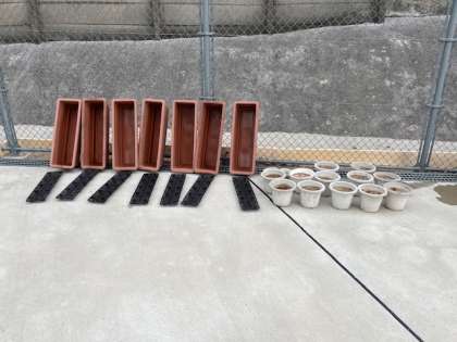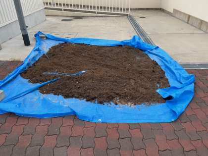 土づくりをしながらプランターを水洗いし、日光消毒をしています。