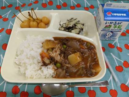 10月6日(金)のこんだては「ハヤシライス〔米粉〕、キャベツのひじきドレッシング、さくらんぼ(缶)、牛乳」です。