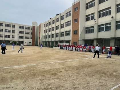 初戦の対戦は、墨江丘中学校。昨年のブロック大会と同じ組合せ、緊張感溢れるゲーム展開です。初回に1点取られるものの、中村先生の素晴らしいピッチングであとは0点に抑えます。3回裏の攻撃、一打逆転のチャンスでしたが、八木先生に一本が出ずに最終回へ。