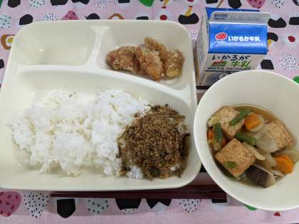 10月12日(木)のこんだては「鶏肉のたつたあげ、あつあげと野菜の煮もの、おかかなっ葉、ごはん、牛乳」です。