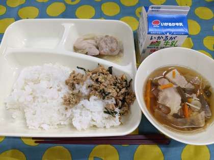 10月16日(月)のこんだては「鶏肉のゆず塩焼き、ソーキ汁、ツナ大豆そぼろ、ごはん、牛乳」です。