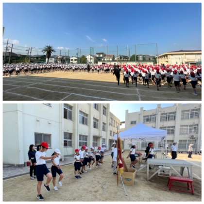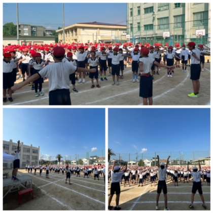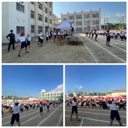 ラジオ体操は、運動委員が前でしっかりと模範を示しています。