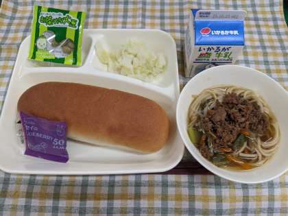 10月17日(火)のこんだては「タンタンめん、あっさりキャベツ、まっ茶大豆、コッペパン、ブルーベリージャム、牛乳」です。