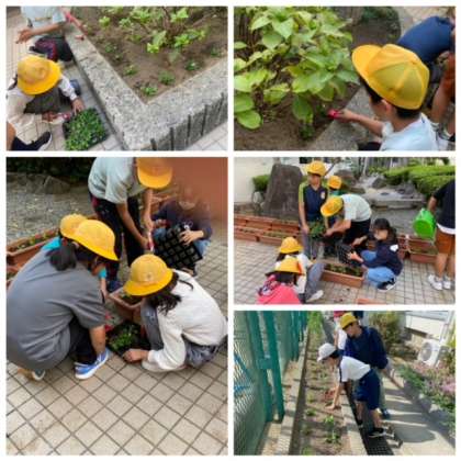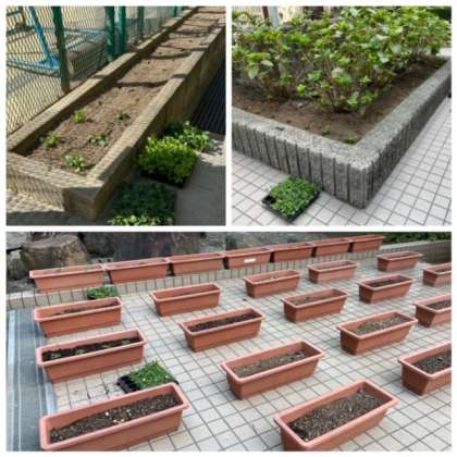 ビオラ・パンジー・ノースポールの苗が届けられたので、栽培委員で花壇やプランターに植えました。美しい花がいっぱい咲いて、みんなの気持ちが明るくなる学校になるようにと、心を込めて植えました。