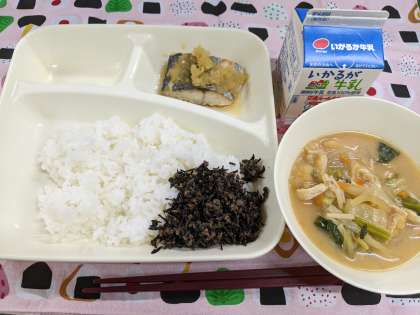 10月19日(木)のこんだては「さごしのみぞれかけ、みそ汁、牛ひじきそぼろ、ごはん、牛乳」です。