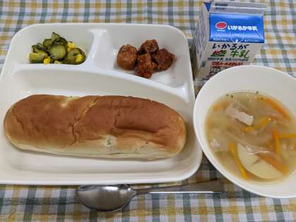 10月24日(火)のこんだては「まぐろのオーロラ煮、スープ、きゅうりとコーンのサラダ、おさつパン、牛乳」です。