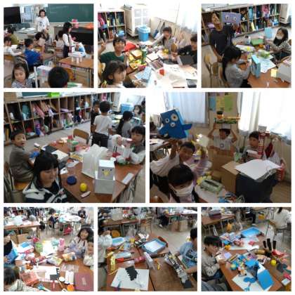1年生は、箱を使って動物を作っていました。思い思いの動物が出来上がりました。