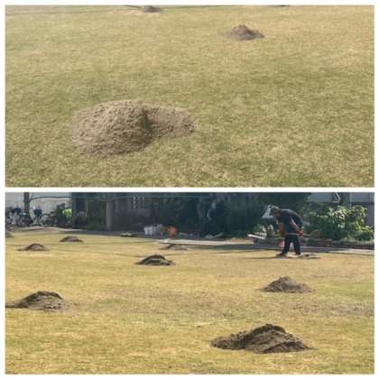 トラック一杯分の目土を、芝生上に分散したあと、手作業で芝生全面に撒いていきます。腰が痛くなるような作業です。