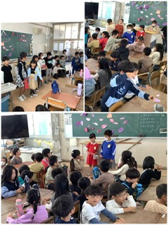 一年生をお芋パーティに招待しました!掘ったお芋を食べたり、各クラスで一年生のために考えたゲームをしました。「緊張する〜」「楽しんでくれるかな?」と緊張していましたが、一年生も楽しんでくれているようで二年生も嬉しそうでした。